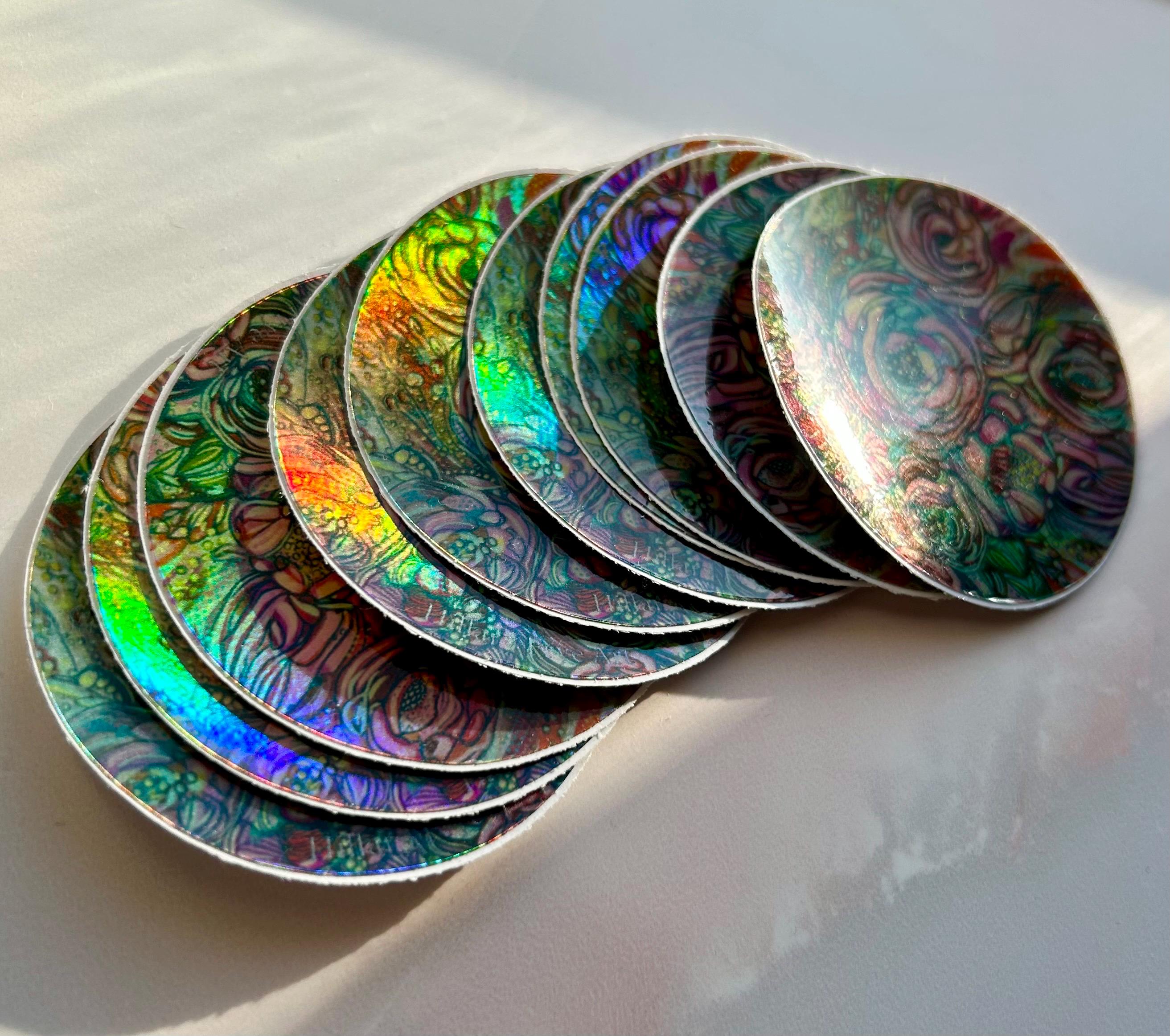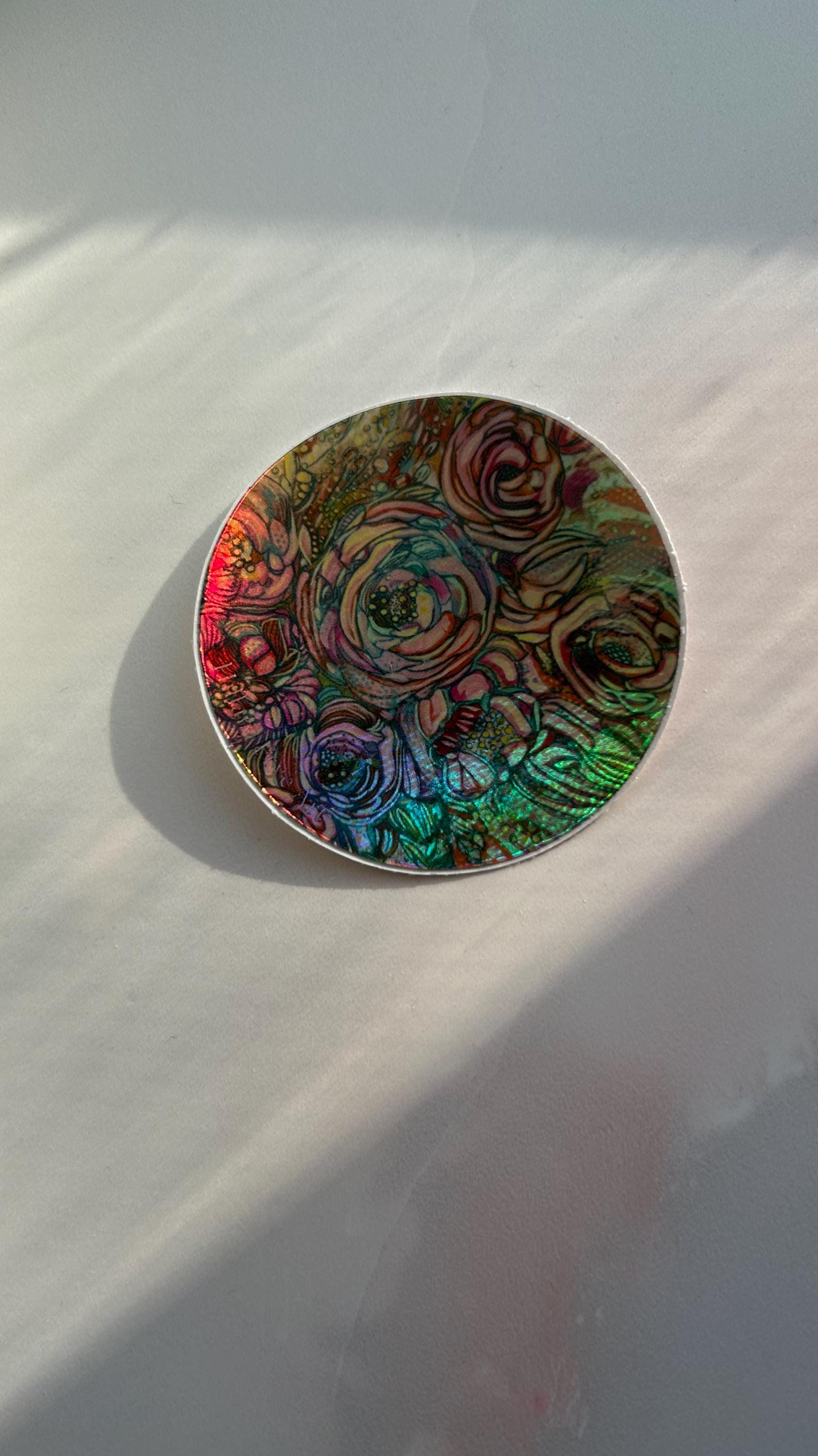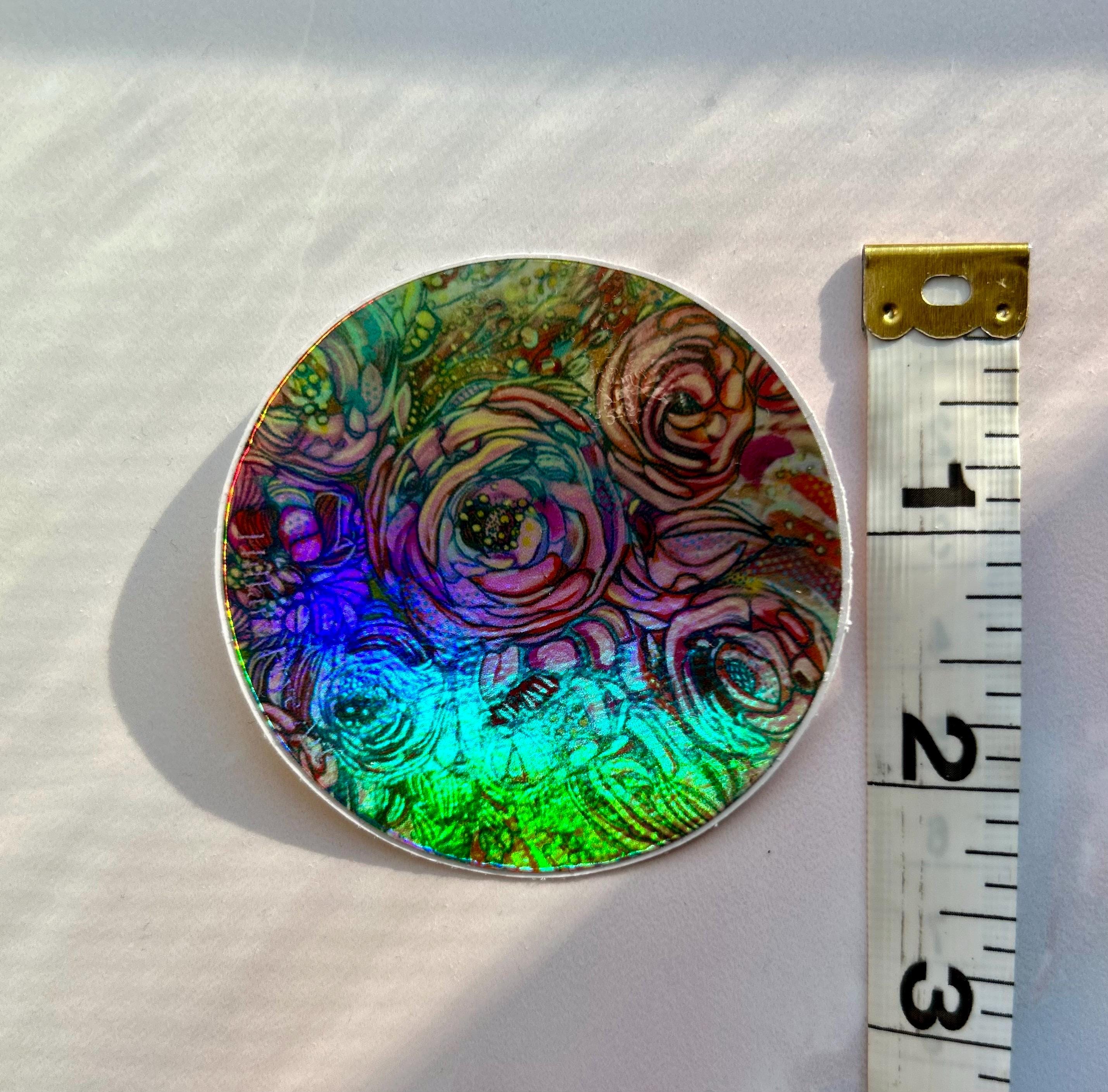 Just in at SudzyMuse- Hillary Frye Art Stickers. Beautiful iridescent Dahlias with a rich, visually textured, multi-color background.
